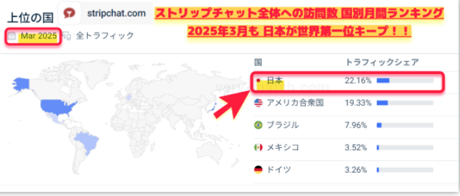 実際、日本はストリップチャットの世界アクセスランキングで常に上位。